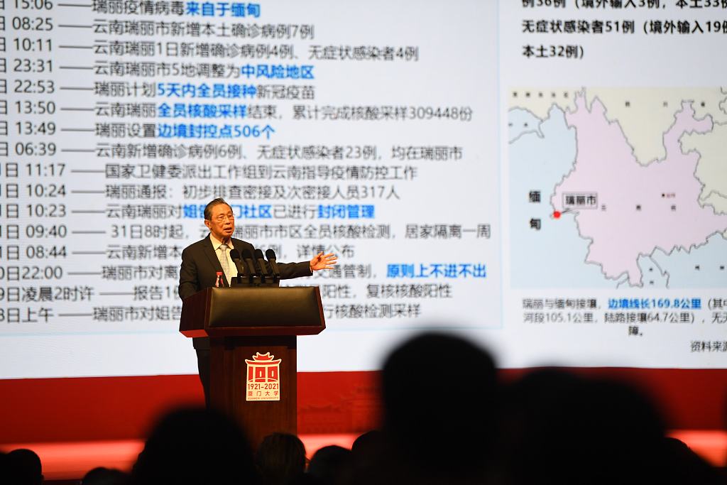 ​4月6日下午,中国工程院院士、呼吸内科学家钟南山在厦门大学开讲《新冠防控策略与疫苗研发》。当日,厦大百年校庆大会举行。图片来源:人民视觉