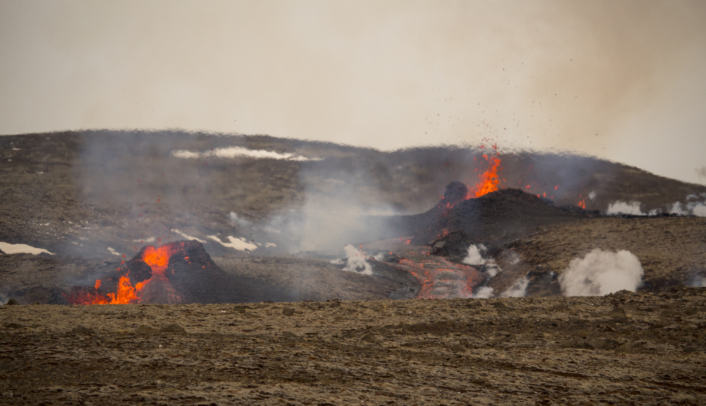 冰岛格尔丁达鲁尔火山出现两个新火山喷发裂缝 搜救队近距离观看熔岩奇观
