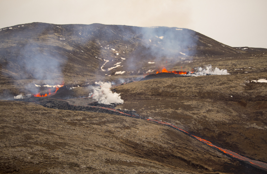 冰岛格尔丁达鲁尔火山出现两个新火山喷发裂缝 搜救队近距离观看熔岩奇观