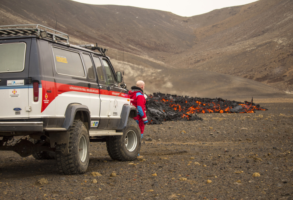 冰岛格尔丁达鲁尔火山出现两个新火山喷发裂缝 搜救队近距离观看熔岩奇观