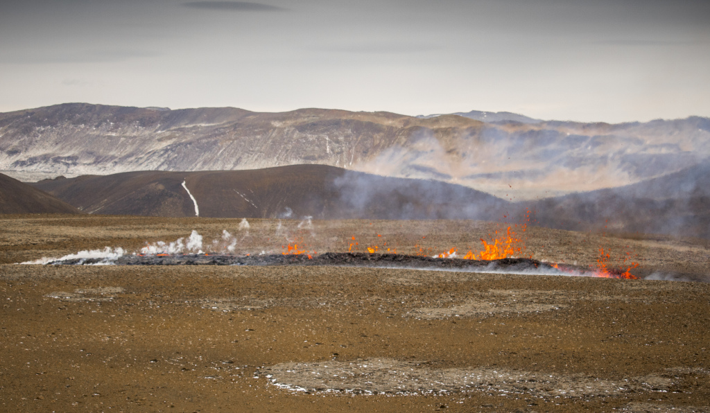 冰岛格尔丁达鲁尔火山出现两个新火山喷发裂缝 搜救队近距离观看熔岩奇观