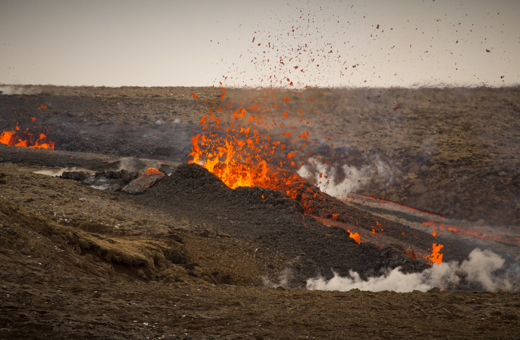 冰岛格尔丁达鲁尔火山出现两个新火山喷发裂缝 搜救队近距离观看熔岩奇观