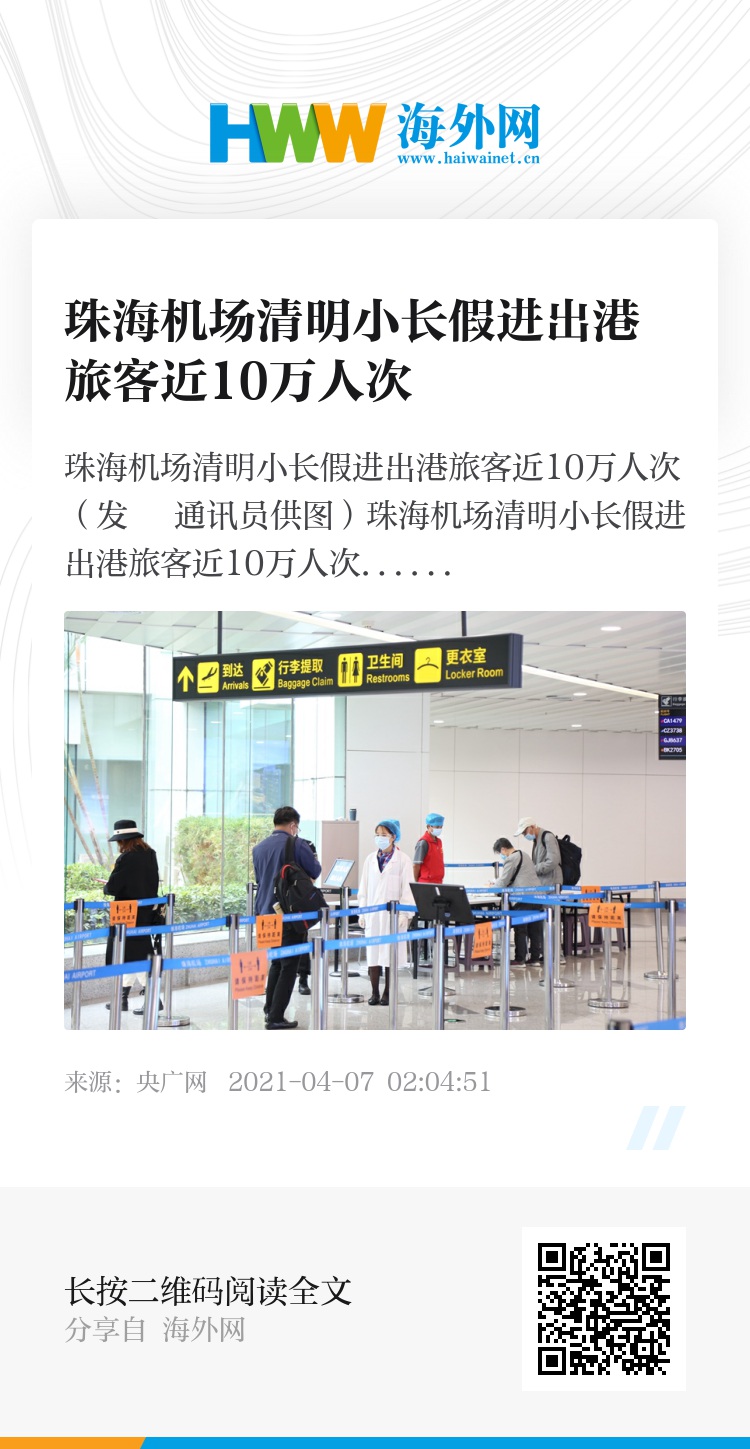 央广网珠海4月6日消息(记者郭翔宇 通讯员余财旺)进入4月以来,珠海机场迎来旅客出行小高峰。清明小长假期间(4月3日-4月5日),珠海机场累计保障航班起降776架次,进出港旅客近10万人次,旅客吞吐量同比2020年(疫情期间)增长5倍,同比2019年(疫情前)增长4%,已超越疫情前水平。其中,4月2日单日进出港旅客达3.8万人次,是珠海机场今年以来单日客流最高的一天。