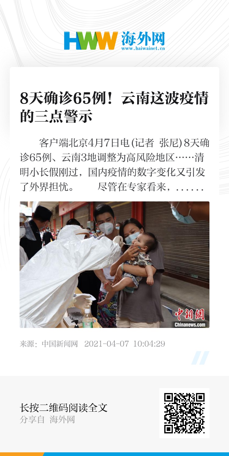 中新网客户端北京4月7日电(记者 张尼)8天确诊65例、云南3地调整为高风险地区……清明小长假刚过,国内疫情的数字变化又引发了外界担忧。