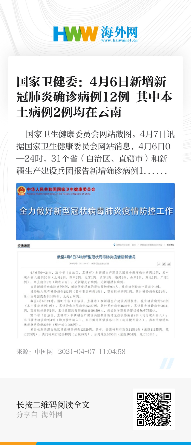 中国网4月7日讯 据国家卫生健康委员会网站消息,4月6日0—24时,31个省(自治区、直辖市)和新疆生产建设兵团报告新增确诊病例12例,其中境外输入病例10例(上海2例,四川2例,北京1例,江苏1例,福建1例,山东1例,湖北1例,广东1例),本土病例2例(均在云南);无新增死亡病例;无新增疑似病例。