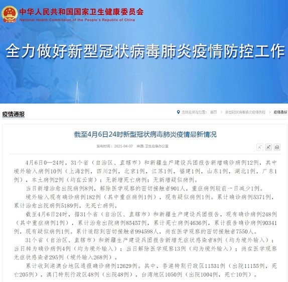 截至4月6日24时,据31个省(自治区、直辖市)和新疆生产建设兵团报告,现有确诊病例248例(其中重症病例1例),累计治愈出院病例85457例,累计死亡病例4636例,累计报告确诊病例90341例,现有疑似病例1例。累计追踪到密切接触者994598人,尚在医学观察的密切接触者7550人。
