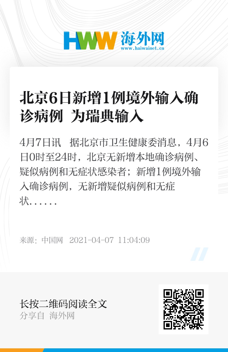 中国网4月7日讯 据北京市卫生健康委消息,4月6日0时至24时,北京无新增本地确诊病例、疑似病例和无症状感染者;新增1例境外输入确诊病例,无新增疑似病例和无症状感染者。