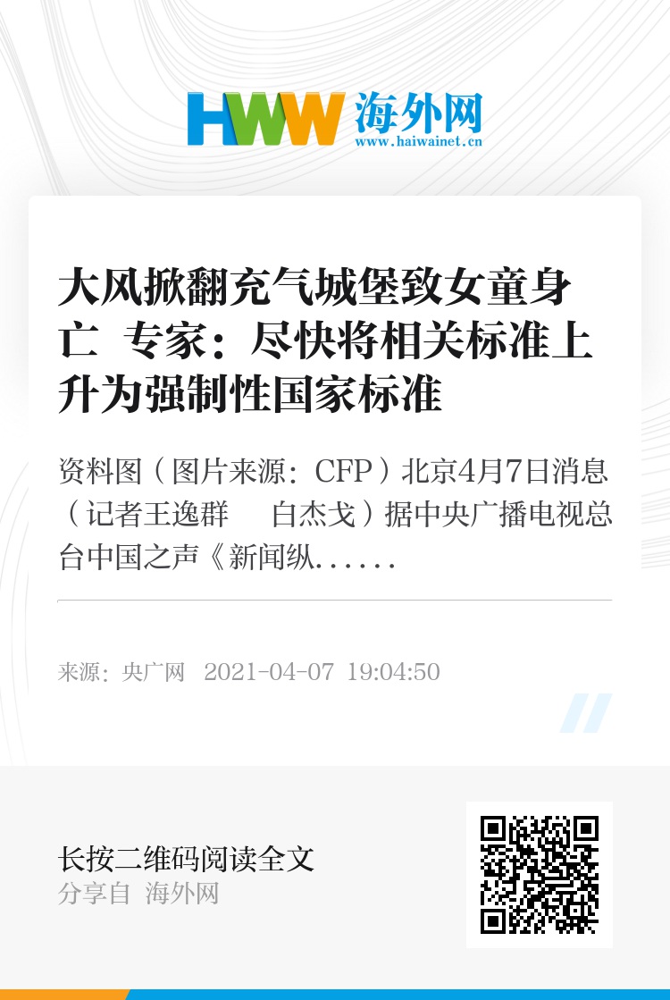 央广网北京4月7日消息(记者王逸群 白杰戈)据中央广播电视总台中国之声《新闻纵横》报道,4月4日下午,山东枣庄市中区某广场上的一座充气城堡被风吹翻,导致一名女童身亡,媒体在标题中用了“痛心!又是它!”“6年25次”这样的关键词,形容类似事件出现的频率和让人揪心的程度。实际上,2019年国家市场监督管理总局、国家标准化管理委员会就已经发布了《充气式游乐设施安全规范》(简称《规范》)国家标准,也对设施的锚固和压载系统提出了明确要求。
