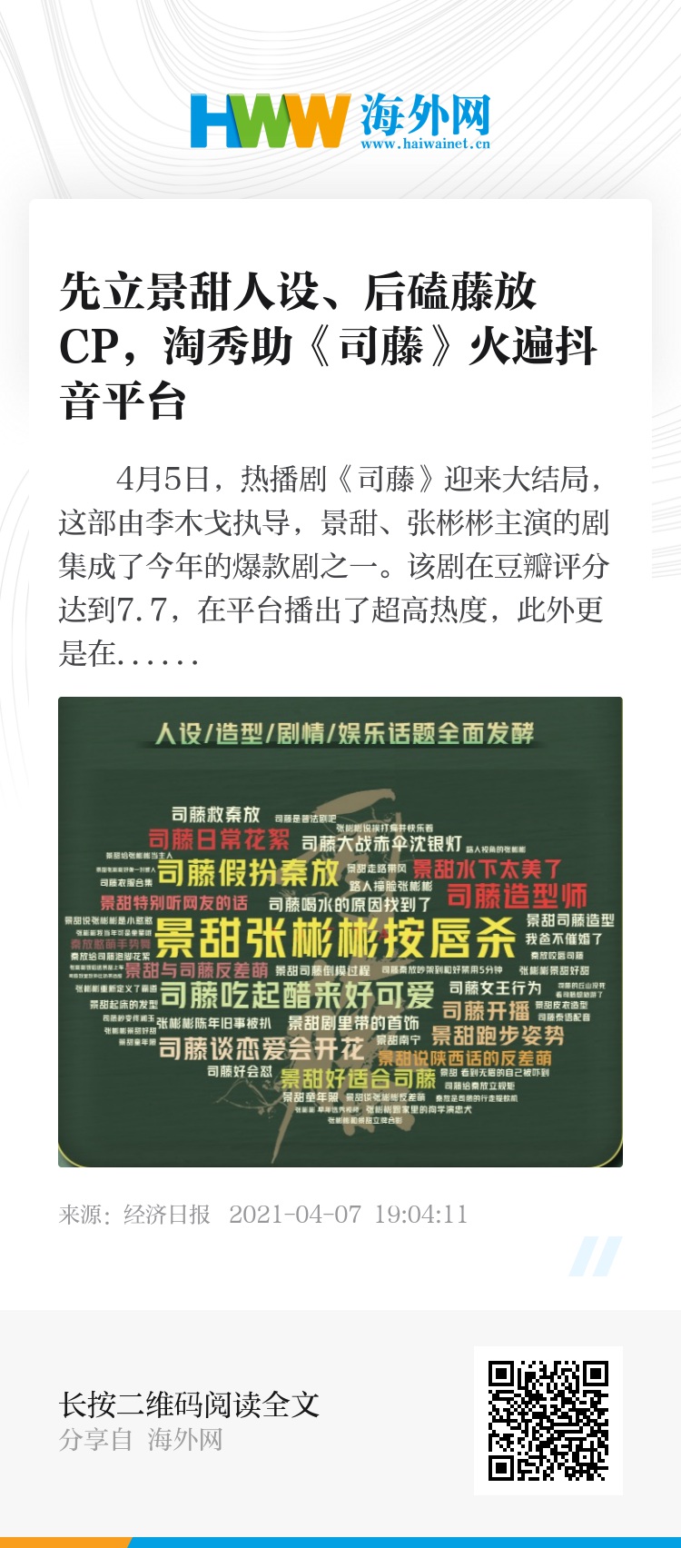 4月5日,热播剧《司藤》迎来大结局,这部由李木戈执导,景甜、张彬彬主演的剧集成了今年的爆款剧之一。该剧在豆瓣评分达到7.7,在平台播出了超高热度,此外更是在抖音平台呈现出一场盛况,为粉丝在观剧之余提供了诸多热议话题。
