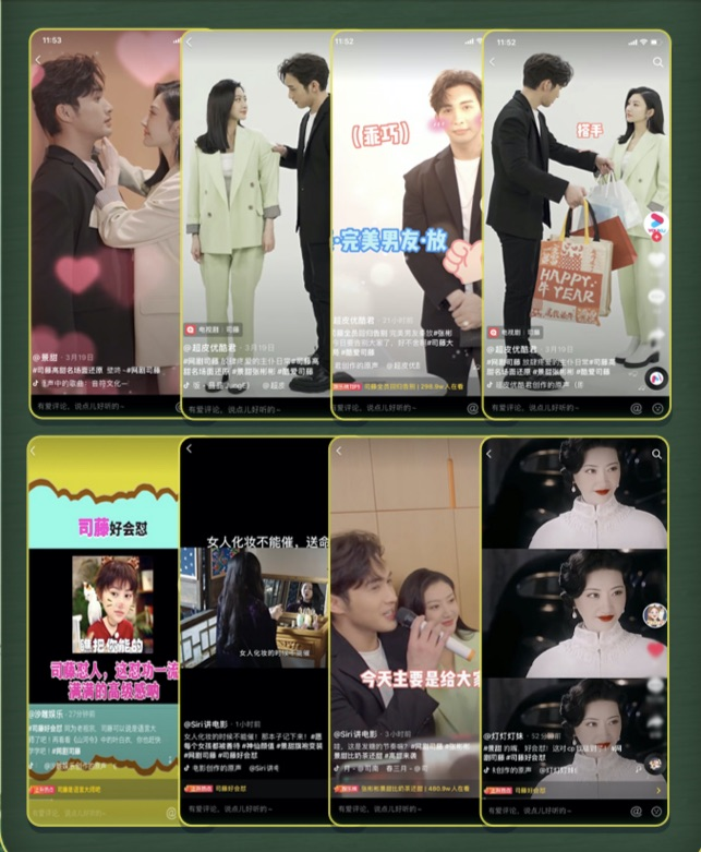 《司藤》开播第二周,淘秀营销还与优酷、片方联动,进行了主演首次合体营业的线下“扫楼”活动,顺势将真人CP的营销点推向高点,大量话题开始自然发酵。“司藤秦放好像回娘家”“景甜张彬彬好像一对新人”等素材,以及由淘秀营销策划、艺人配合拍摄的短视频内容,开始在抖音上进行传播,大量剧粉、书粉在抖音物料的引导下变成磕糖粉,海量CP大军由此形成,并使角色CP向RPS(真人CP)方向破圈。
