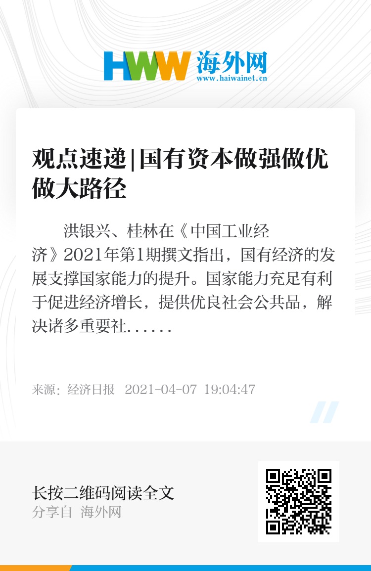 洪银兴、桂林在《中国工业经济》2021年第1期撰文指出,国有经济的发展支撑国家能力的提升。国家能力充足有利于促进经济增长,提供优良社会公共品,解决诸多重要社会问题,为国民经济托底。做强做优做大国有资本是加强国家能力建设的基本途径。国有资本的做强,既要遵循资本属性,又要依靠市场规律。国有资本的做优,不仅要求优化国家作为国有资本所有者的行为,还要优化国有企业治理结构,完善企业家选拔与激励制度,并优化国有资本在高新技术产业的投资布局。借助资本积累特别是资本集中,国有资本可以快速做大。混合所有制是实现做大国有资本的具体有效形式,但要建立相应机制防范国有资本“化公为私”“脱实向虚”和资本无限制扩张等问题。国有资本做强做优做大不以削弱民营经济为代价,而是在公平竞争中与民营资本做强做优做大相辅相成,这是中国特色社会主义经济的重要特征。