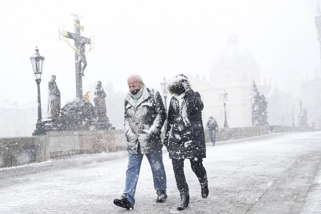 当地时间2021年4月6日,捷克布拉格,民众冒着暴风雪,走过查理大桥。图源:IC photo