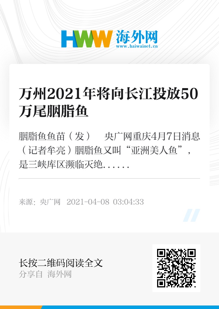 央广网重庆4月7日消息(记者牟亮)胭脂鱼又叫“亚洲美人鱼”,是三峡库区濒临灭绝的长江稀有珍贵鱼种,被国家列为二级濒危珍稀动物。2021年,重庆万州区将向长江投放50万尾胭脂鱼鱼苗。