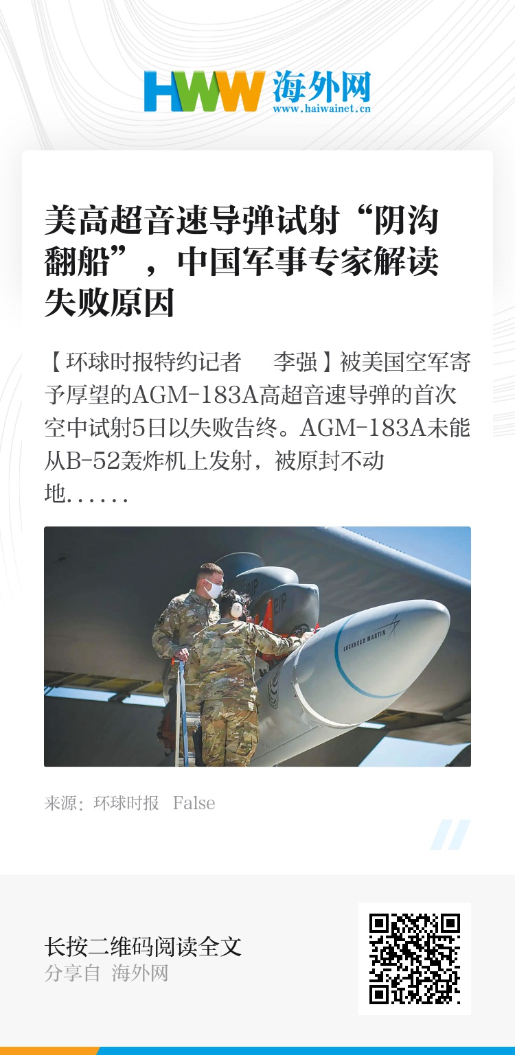 【环球时报特约记者 李强】被美国空军寄予厚望的AGM-183A高超音速导弹的首次空中试射5日以失败告终。AGM-183A未能从B-52轰炸机上发射,被原封不动地带回了基地。专家表示,此次试验难度不大,但AGM-183A仍然出师不利,有些阴沟里翻船的感觉。这也让美国空军在与陆军、海军的高超音速导弹武器竞赛中处于下风。