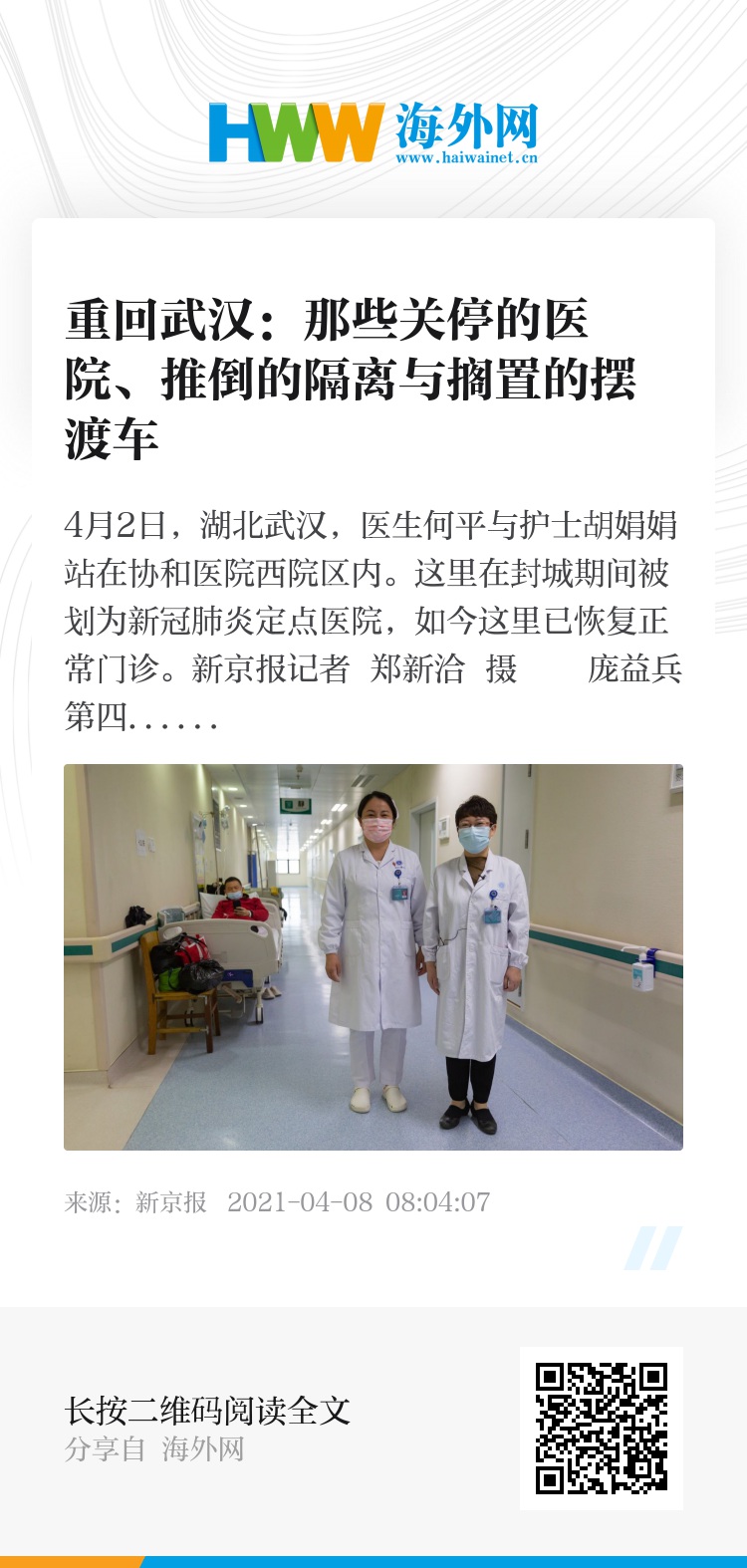 若非呼机上残留着反复消毒的白色痕迹、微信群里仍每天收到新冠康复者的问好,护士胡娟娟会觉得去年的疫情就是一场梦。在“梦”里,这个病区被严格封闭,穿戴三级防护才能进入,上百名新冠患者在此住院,他们不能离开病房在走廊上转悠,常常站在房门内,从玻璃窗里向她张望。