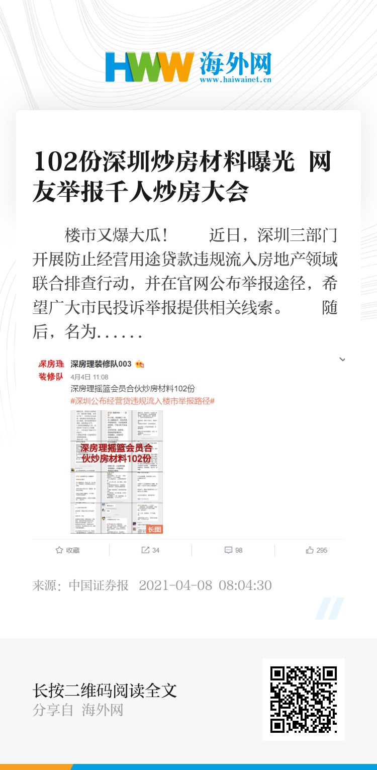 4月2日,深圳人民银行发布了《关于公布对经营用途贷款违规流入房地产领域问题投诉举报途径的通知》,针对房地产市场是否有违规资金进入,提供了举报途径。