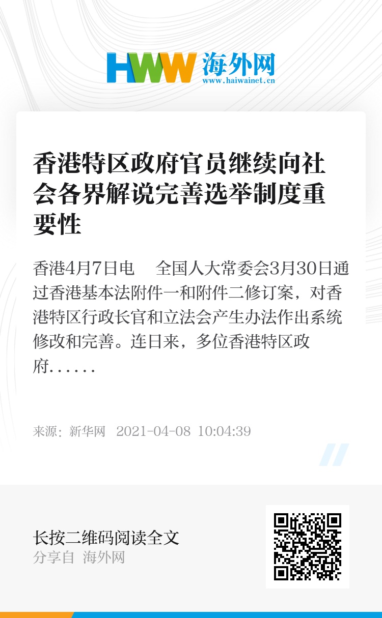 新华社香港4月7日电 全国人大常委会3月30日通过香港基本法附件一和附件二修订案,对香港特区行政长官和立法会产生办法作出系统修改和完善。连日来,多位香港特区政府官员分别出席多场解说会,向社会各界讲解完善选举制度的重要性。
