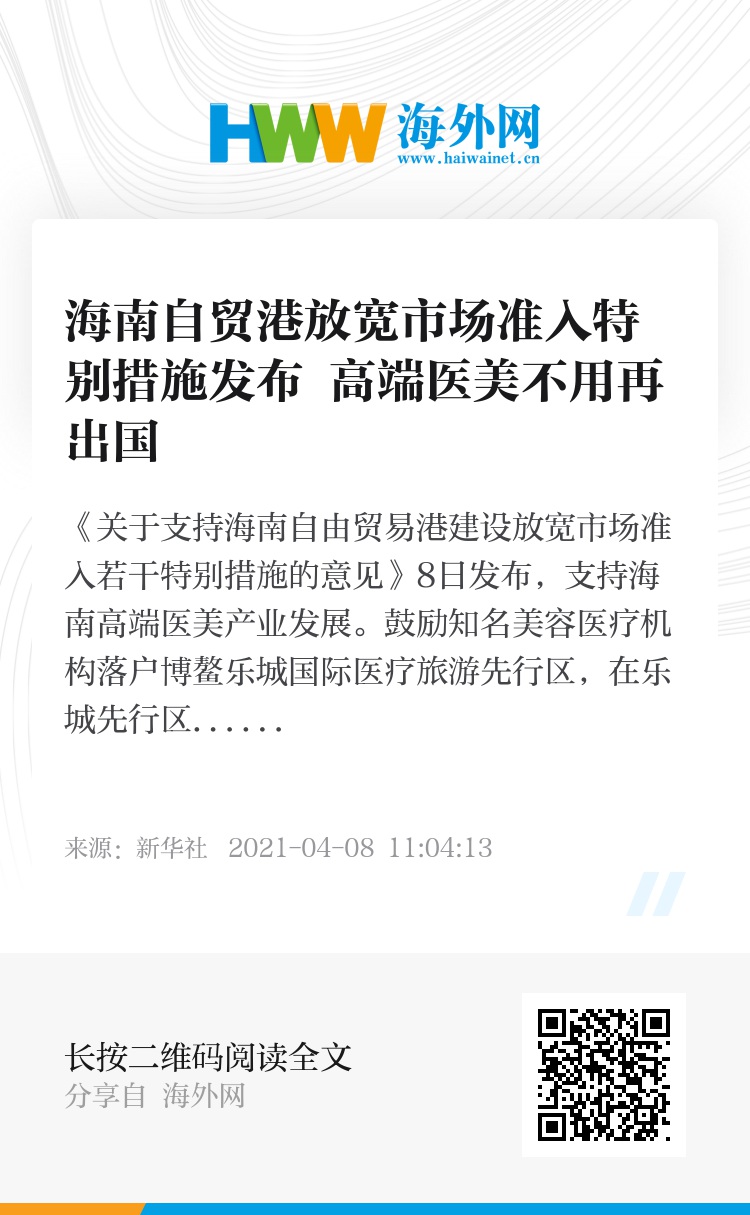 《关于支持海南自由贸易港建设放宽市场准入若干特别措施的意见》8日发布,支持海南高端医美产业发展。鼓励知名美容医疗机构落户博鳌乐城国际医疗旅游先行区,在乐城先行区的美容医疗机构可批量使用在美国、欧盟、日本等国家或地区上市的医美产品,其中属于需在境内注册或备案的药品、医疗器械、化妆品,应依法注册或备案,乐城先行区可制定鼓励措施。支持国外高水平医疗美容医生依法依规在海南短期行医,推动发展医疗美容旅游产业,支持引进、组织国际性、专业化的医美产业展会、峰会、论坛,规范医疗美容机构审批和监管。(记者邹多为、安蓓)