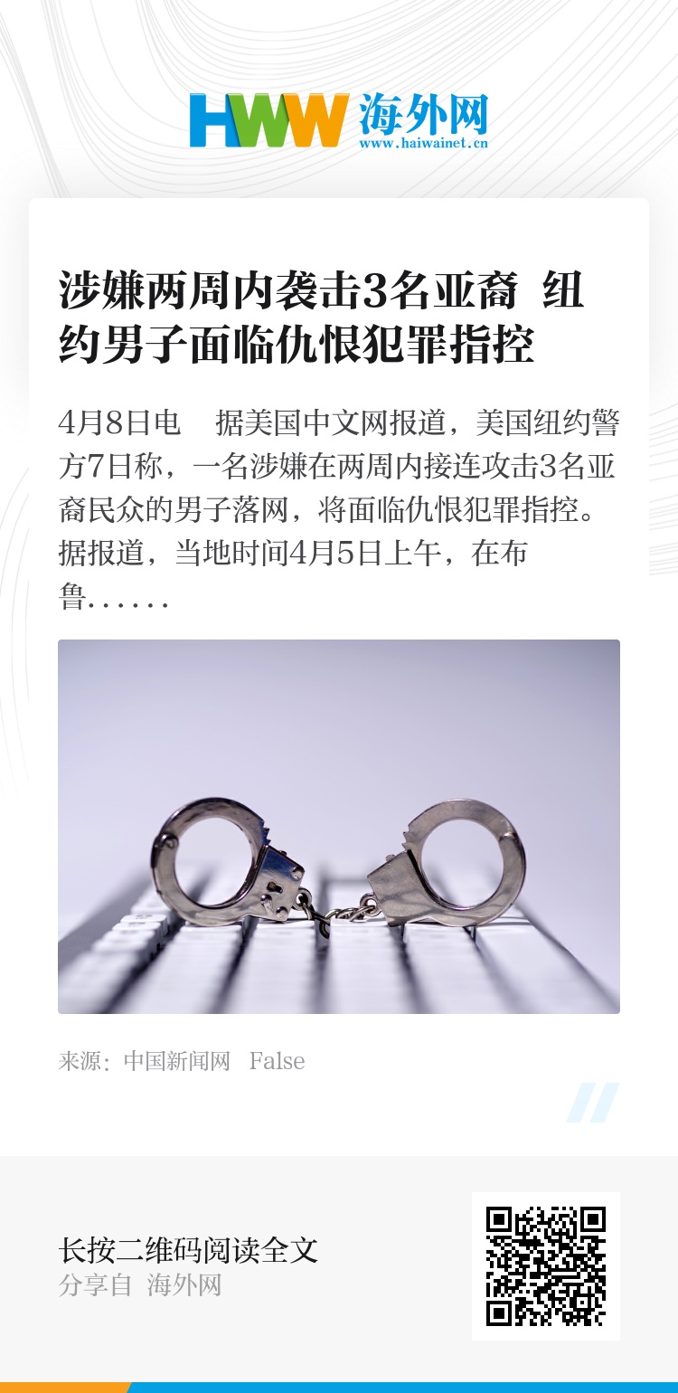 中新网4月8日电 据美国中文网报道,美国纽约警方7日称,一名涉嫌在两周内接连攻击3名亚裔民众的男子落网,将面临仇恨犯罪指控。