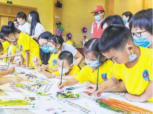 2020年6月9日,20余名火神山、雷神山“两山”医院建设者的孩子们,在武汉花山生态城作画,画出父母建设的项目工程。(湖北日报全媒记者 梅涛 通讯员 潘海亮 摄)
