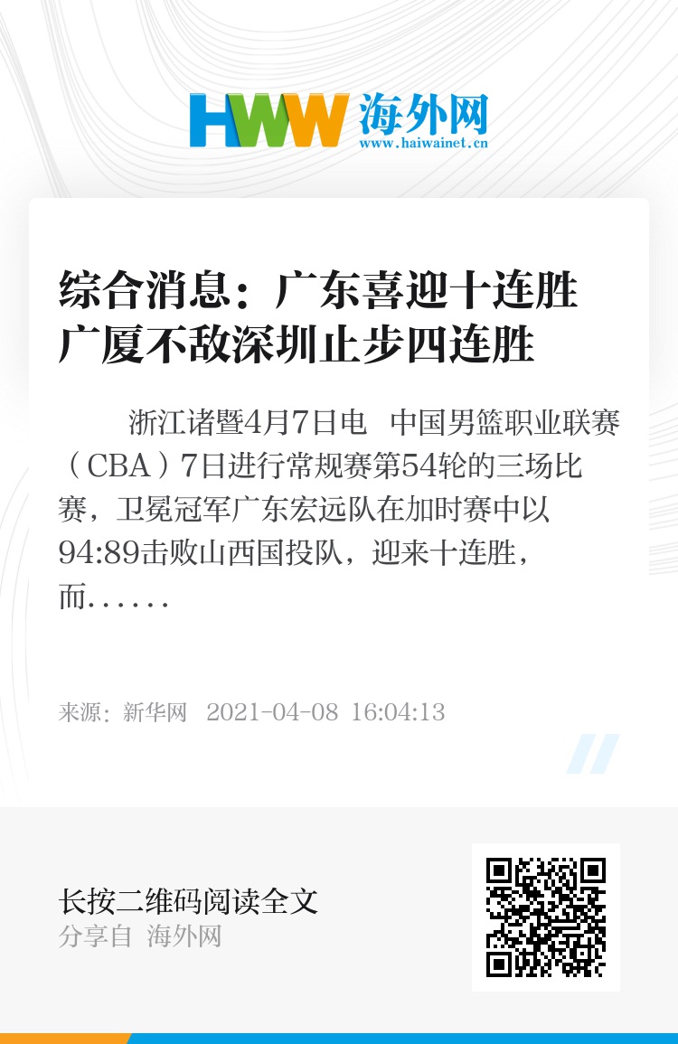 新华社浙江诸暨4月7日电 中国男篮职业联赛(CBA)7日进行常规赛第54轮的三场比赛,卫冕冠军广东宏远队在加时赛中以94:89击败山西国投队,迎来十连胜,而浙江广厦队则是以96:103负于深圳新世纪队。