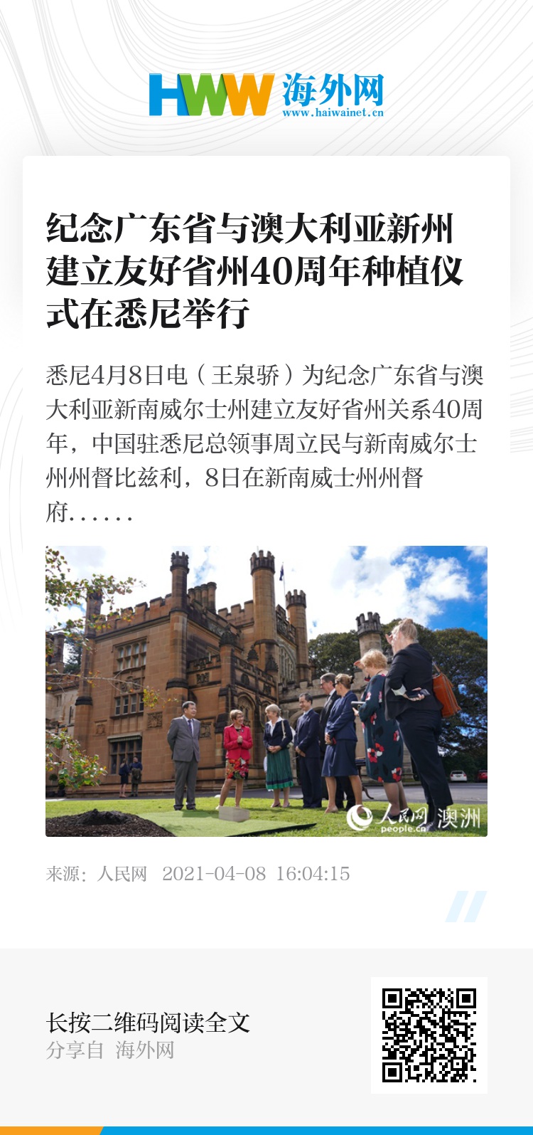 人民网悉尼4月8日电(王泉骄)为纪念广东省与澳大利亚新南威尔士州建立友好省州关系40周年,中国驻悉尼总领事周立民与新南威尔士州州督比兹利,8日在新南威士州州督府内共同种下一棵银杏树。