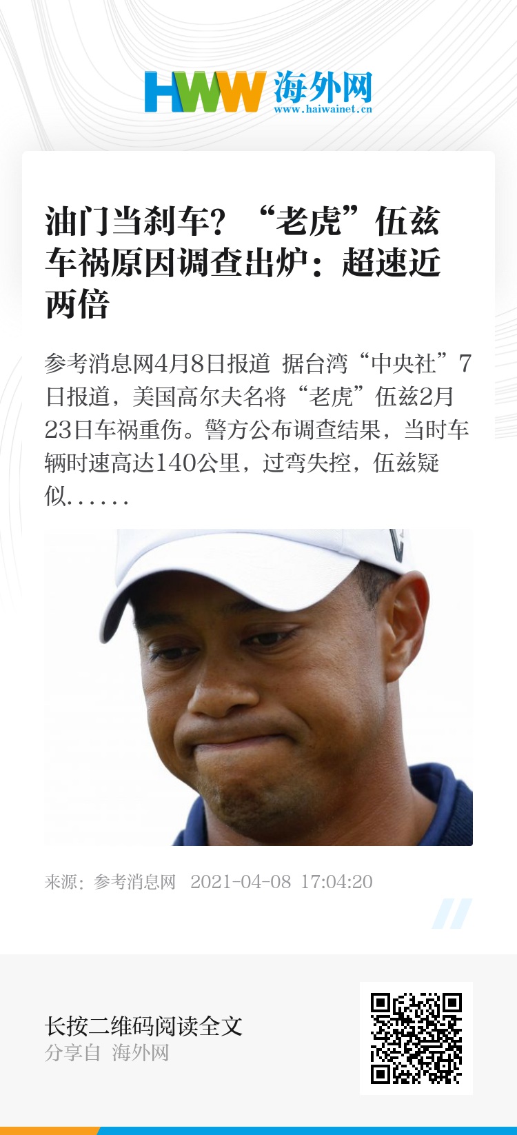 参考消息网4月8日报道 据台湾“中央社”7日报道,美国高尔夫名将“老虎”伍兹2月23日车祸重伤。警方公布调查结果,当时车辆时速高达140公里,过弯失控,伍兹疑似把油门当成刹车。