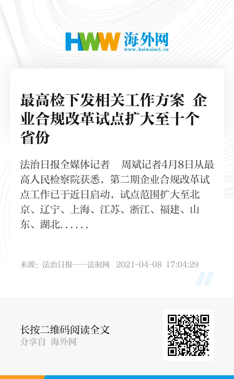 记者4月8日从最高人民检察院获悉,第二期企业合规改革试点工作已于近日启动,试点范围扩大至北京、辽宁、上海、江苏、浙江、福建、山东、湖北、湖南、广东等十个省(直辖市)。这些省级检察院可根据本地情况,自行确定1至2个设区的市级检察院及其所辖基层院作为试点单位。