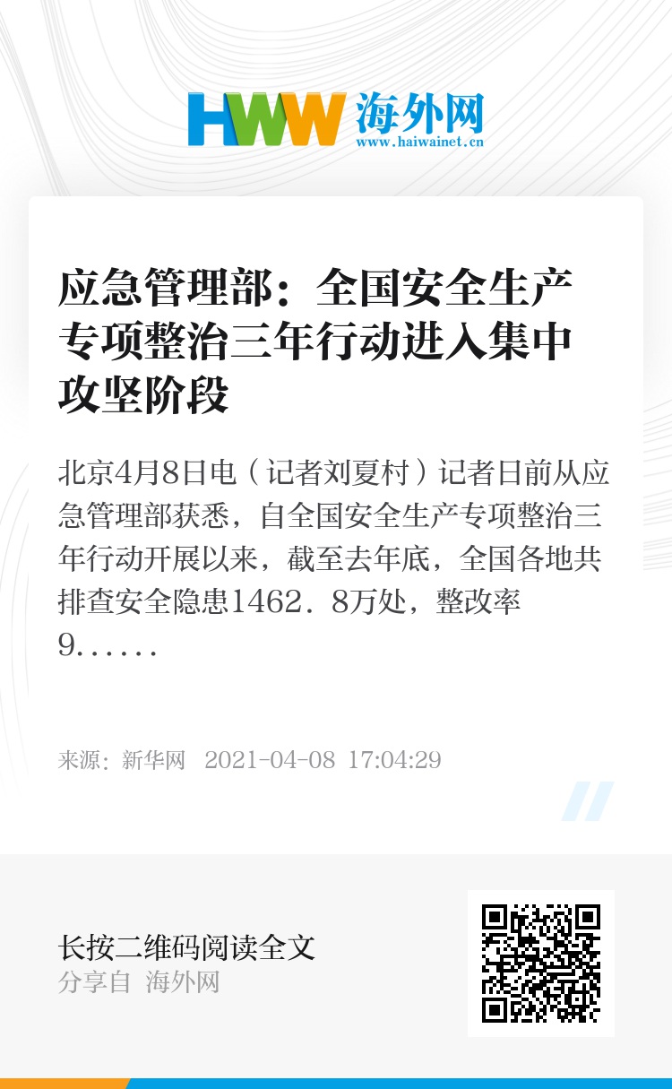 应急管理部有关负责人介绍,全国安全生产专项整治三年行动从2020年4月至2022年12月,分动员部署、排查整治、集中攻坚、巩固提升四个阶段进行,今年进入集中攻坚阶段,抓住重点难点问题发力攻坚。