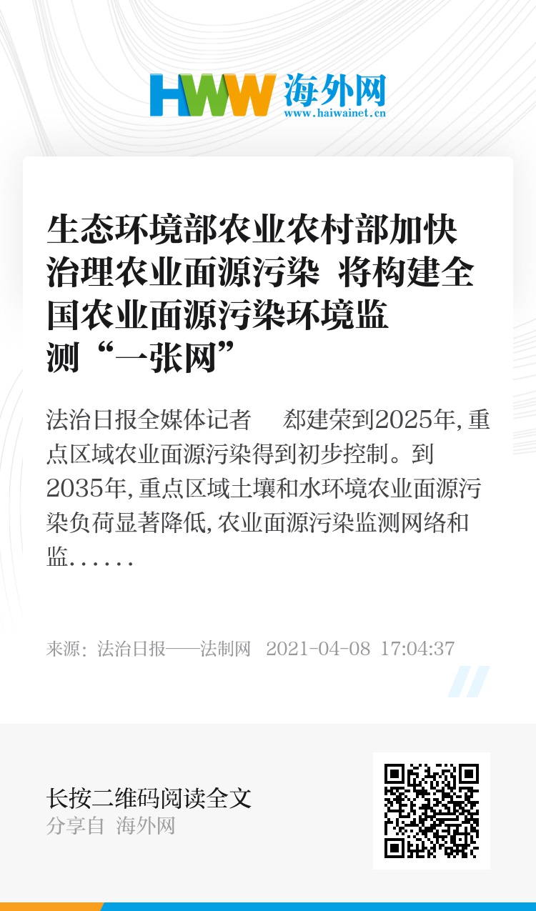 两部相关负责人说,生态环境部、农业农村部将以加强农业面源污染治理监督管理为核心,开展农业面源污染调查监测、负荷评估,建设农业生态环境野外观测超级站和农业面源污染监管平台,不断强化农业面源污染监管水平;同时,强化示范引领,建设一批以污染防治、调查监测、绩效评估等为主要内容的试点示范工程,形成农业面源污染防治典型模式,完善农业面源污染调查监测体系,探索农业面源污染防治绩效评估。