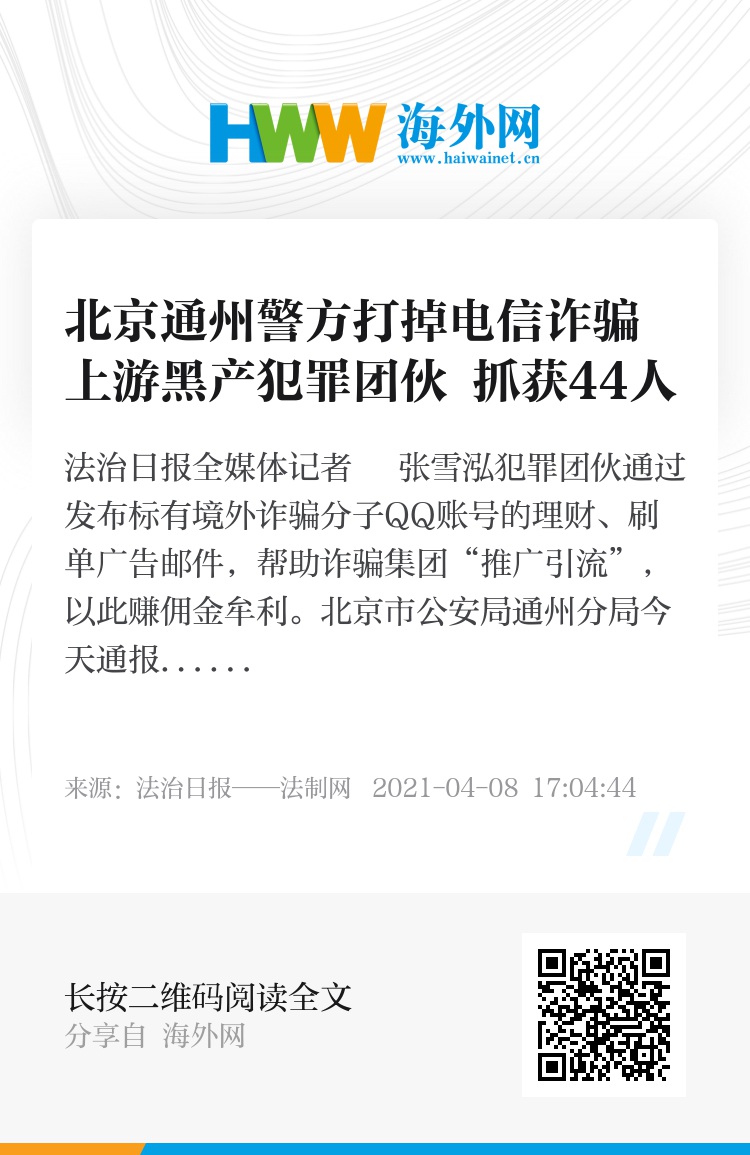 犯罪团伙通过发布标有境外诈骗分子QQ账号的理财、刷单广告邮件,帮助诈骗集团“推广引流”,以此赚佣金牟利。北京市公安局通州分局今天通报,近日,通州警方组织百余警力连夜奔赴山东,打掉一个为境外电信诈骗集团提供“引流”服务的非法利用信息网络犯罪团伙,抓获嫌疑人44名,查扣涉案电子设备100余部,涉案金额达100余万元。