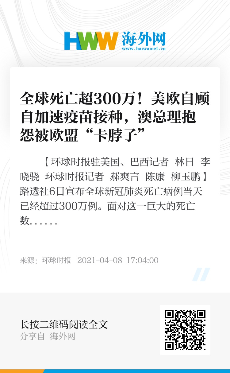【环球时报驻美国、巴西记者 林日 李晓骁 环球时报记者 郝爽言 陈康 柳玉鹏】路透社6日宣布全球新冠肺炎死亡病例当天已经超过300万例。面对这一巨大的死亡数字,美国等西方媒体却很少关注。美国媒体将焦点放在夸赞自己的疫苗接种成绩上,声称拜登政府将在上任前100天完成2亿剂疫苗接种,“完全超出了期待”。目前欧盟不顾内部疫情恶化也重申今年夏季会实现群体免疫,为此要实施更严格的疫苗出口禁令,甚至连盟友澳大利亚订购的300万剂疫苗也不放过。尽管西方口头上宣称要“分享”多余的疫苗,但实际上却一毛不拔。世界卫生组织总干事谭德塞6日痛斥,直到现在,一些穷国仍无法获得疫苗,无从开始为医疗人员和最脆弱群体接种,“这是最荒诞的事”。