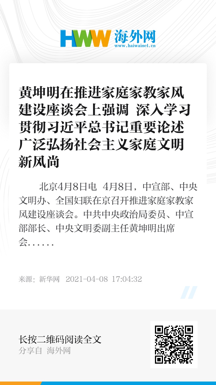 新华社北京4月8日电 4月8日,中宣部、中央文明办、全国妇联在京召开推进家庭家教家风建设座谈会。中共中央政治局委员、中宣部部长、中央文明委副主任黄坤明出席会议并讲话,强调要以《习近平关于注重家庭家教家风建设论述摘编》出版为契机,深入学习贯彻习近平总书记重要指示精神,大力加强家庭文明建设,广泛弘扬社会主义家庭文明新风尚,汇聚亿万家庭的力量奋斗新时代、奋进新征程。