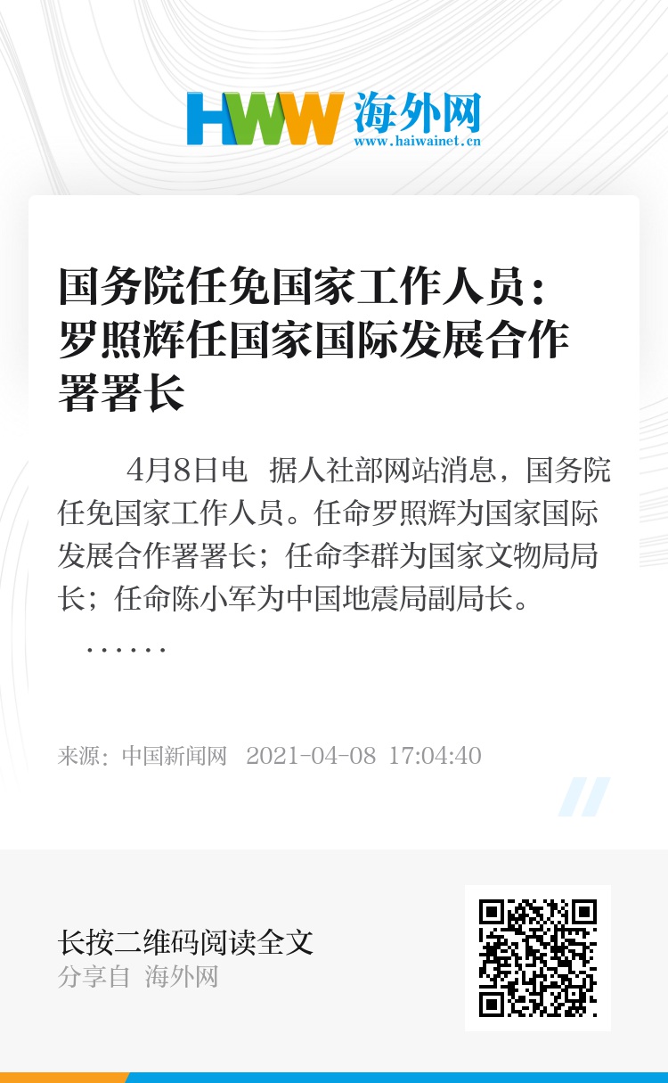中新网4月8日电 据人社部网站消息,国务院任免国家工作人员。任命罗照辉为国家国际发展合作署署长;任命李群为国家文物局局长;任命陈小军为中国地震局副局长。