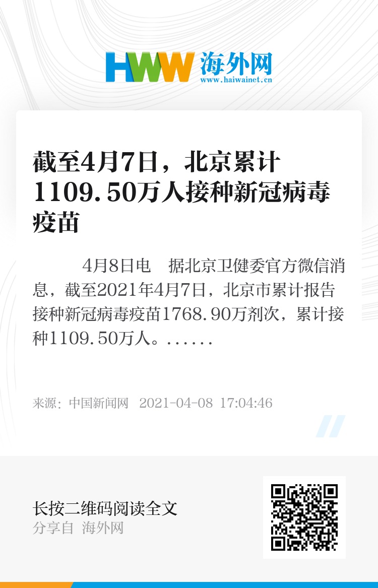 中新网4月8日电 据北京卫健委官方微信消息,截至2021年4月7日,北京市累计报告接种新冠病毒疫苗1768.90万剂次,累计接种1109.50万人。