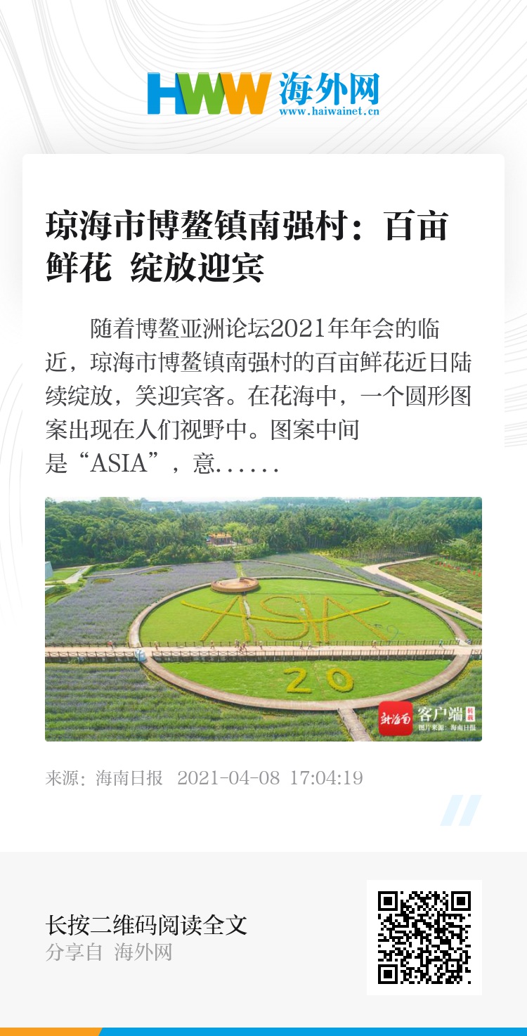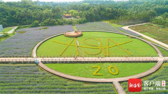 随着博鳌亚洲论坛2021年年会的临近,琼海市博鳌镇南强村的百亩鲜花近日陆续绽放,笑迎宾客。在花海中,一个圆形图案出现在人们视野中。图案中间是“ASIA”,意为亚洲;字母下方,是数字的“20”,这是该村为纪念博鳌亚洲论坛成立20周年而特意设计的。