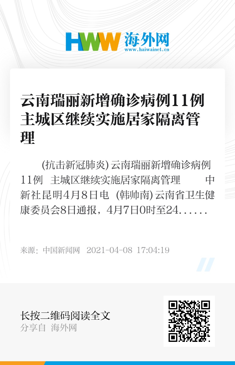 中新社昆明4月8日电 (韩帅南)云南省卫生健康委员会8日通报,4月7日0时至24时,该省新增确诊病例11例(含3例无症状感染者转确诊病例),新增无症状感染者1例,均在瑞丽市。面对仍在持续的疫情,瑞丽市主城区(含姐告)将继续实施居家隔离管理,解除时间视疫情情况而定。