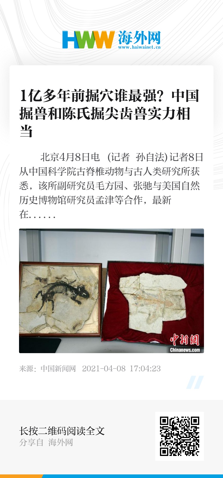 中新网北京4月8日电 (记者 孙自法)记者8日从中国科学院古脊椎动物与古人类研究所获悉,该所副研究员毛方园、张驰与美国自然历史博物馆研究员孟津等合作,最新在中国东北热河生物群发现早白垩纪(约1.3亿到1.1亿年前)的两个哺乳形动物新属新种化石——中国掘兽和陈氏掘尖齿兽,是热河生物群中首次发现的前爪挖掘型穴居哺乳形动物。