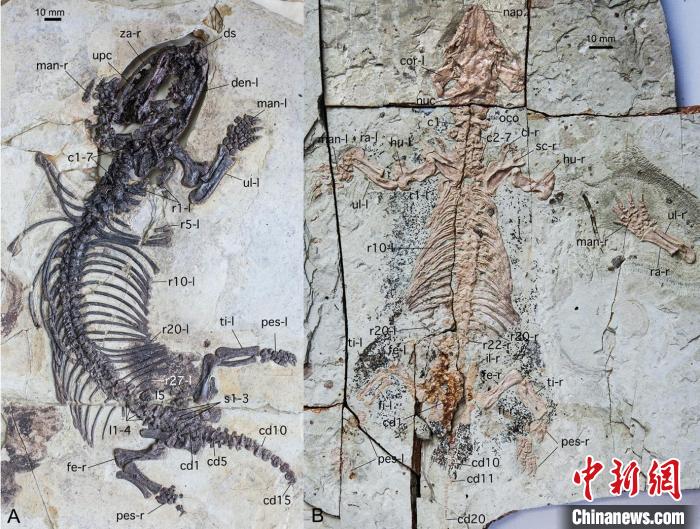 论文第一作者兼共同通讯作者毛方园介绍说,中国掘兽是来自辽宁省九佛堂组的三列齿兽(一种类似哺乳动物的爬行动物),体长316毫米,也是热河生物群发现的首个三列齿兽。陈氏掘尖齿兽发现于辽宁省义县组,它比中国掘兽小,体长183毫米,是热河生物群中较常见的真三尖齿兽(现代有胎盘类哺乳动物和有袋类动物的远亲)。