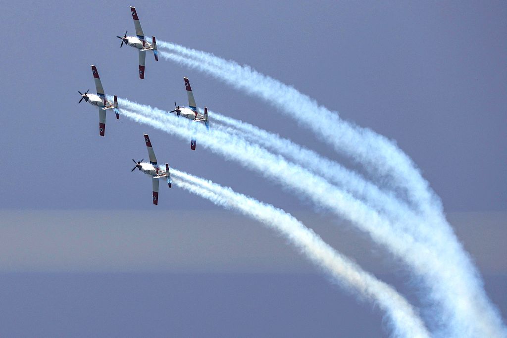 当地时间2021年4月7日,以色列特拉维夫,以色列空军飞机进行独立日飞行表演彩排。图源:人民视觉/视觉中国