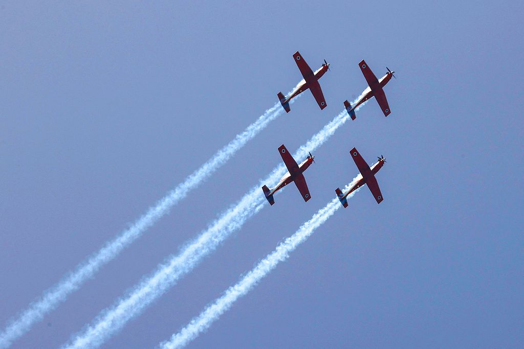 当地时间2021年4月7日,以色列特拉维夫,以色列空军飞机进行独立日飞行表演彩排。图源:人民视觉/视觉中国