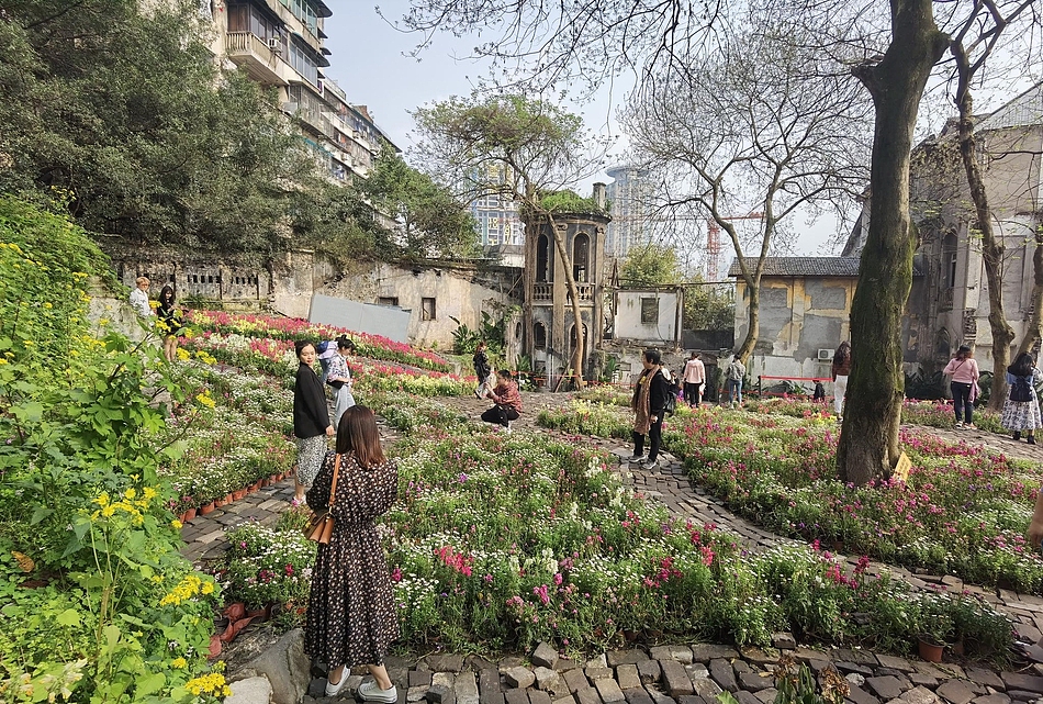 4月8日,重庆市渝中区山城巷的百年建筑仁爱堂旁诞生了一个“荒野花园”,这里曾经是一片等待被拆除的建筑。据了解,该花园原本是废弃多年的垃圾场,在清理掉上千吨垃圾后,在废墟上打造出4000多平方米的花园,共使用了紫罗兰、郁金香、薰衣草和多肉植物在内的上万盆花卉,内容包括花瀑、微型花园景观等,构筑了一幅浪漫的画卷,吸引了众多市民游客前往打卡拍照。图片来源:视觉中国