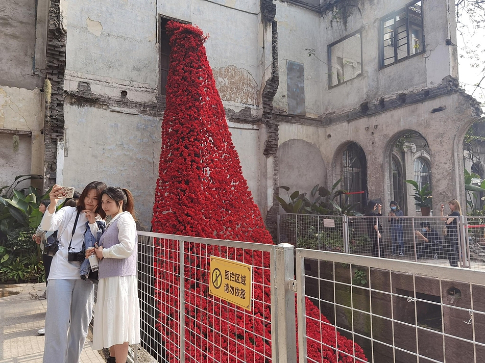 4月8日,重庆市渝中区山城巷的百年建筑仁爱堂旁诞生了一个“荒野花园”,这里曾经是一片等待被拆除的建筑。据了解,该花园原本是废弃多年的垃圾场,在清理掉上千吨垃圾后,在废墟上打造出4000多平方米的花园,共使用了紫罗兰、郁金香、薰衣草和多肉植物在内的上万盆花卉,内容包括花瀑、微型花园景观等,构筑了一幅浪漫的画卷,吸引了众多市民游客前往打卡拍照。图片来源:视觉中国