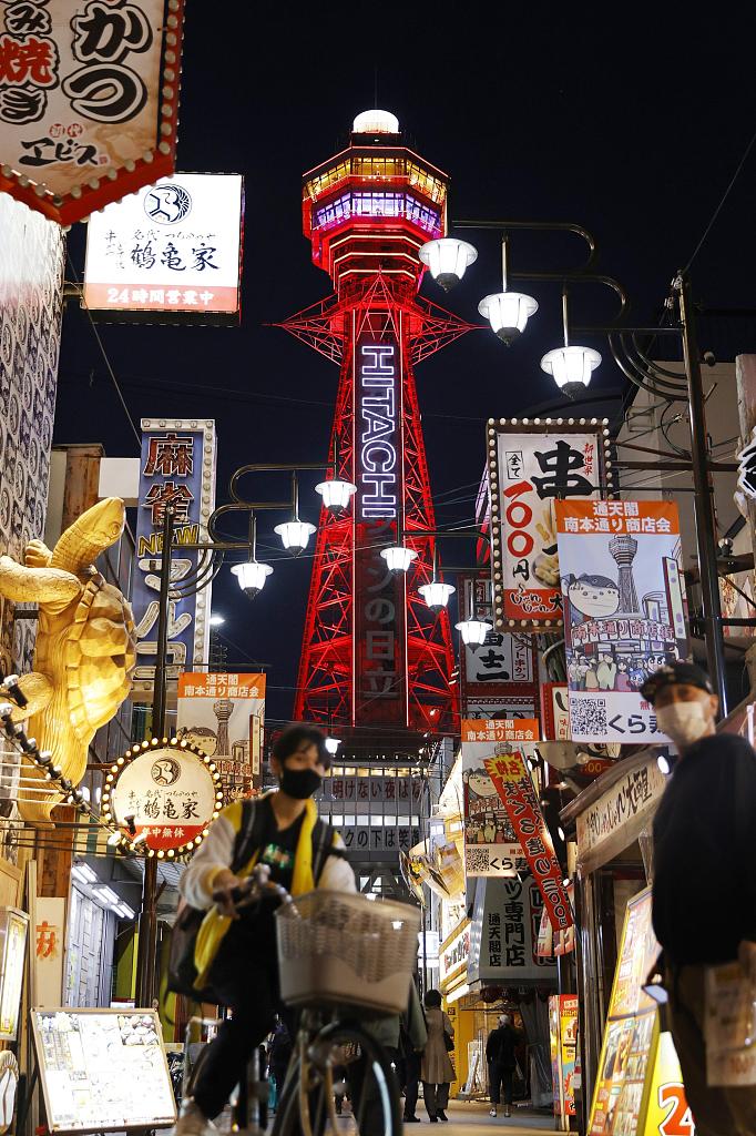 日本大阪新冠病例激增 地标“通天阁”点亮红灯示警