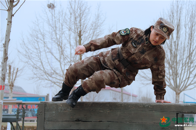 三下五除二,她爬上了悬梯,速度不比男兵慢。女兵的军事训练同样要跟上,或许在身体条件上不如男兵,但她们从未放松对自己的严格要求,不管是爬绳还是越障,课目一项都不能落下。
