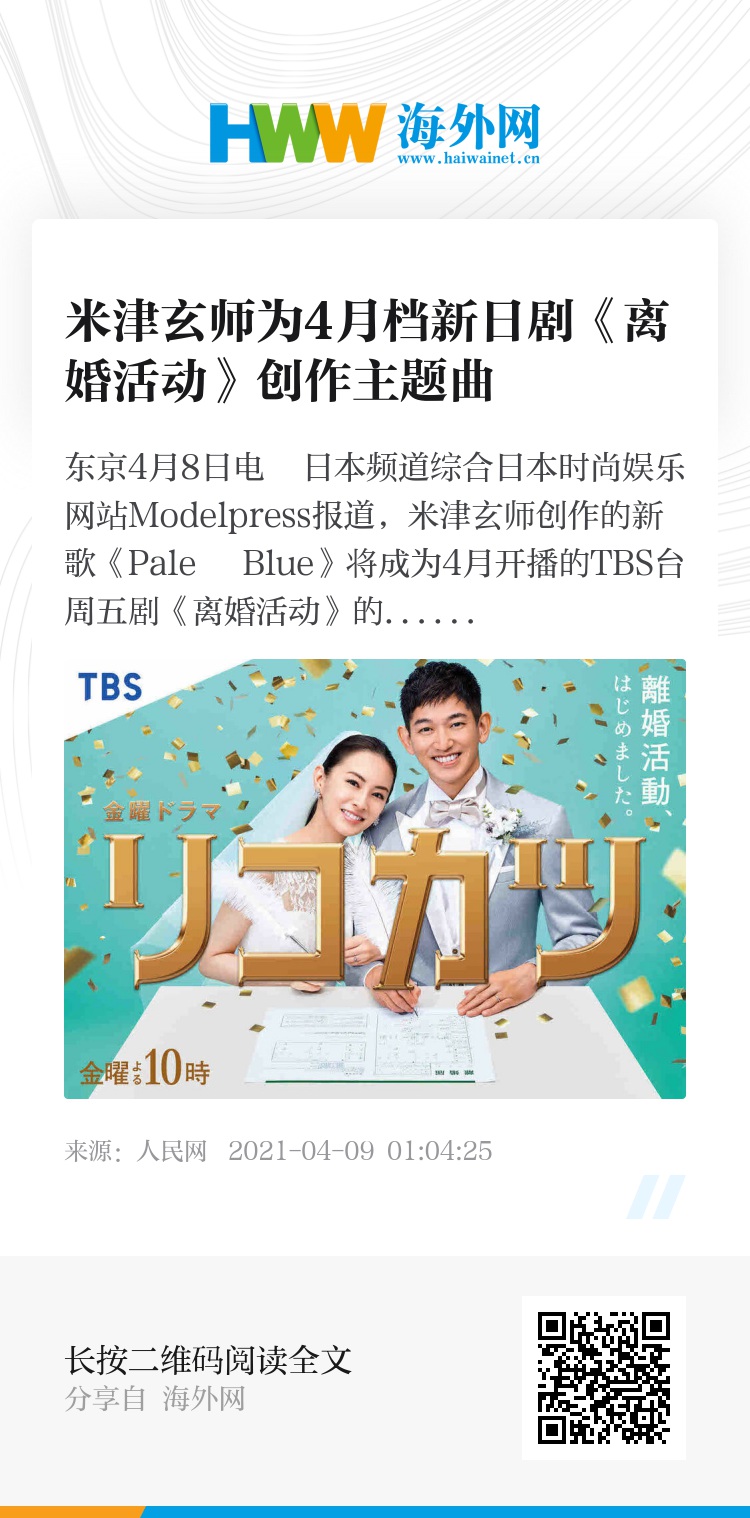 人民网东京4月8日电 日本频道综合日本时尚娱乐网站Modelpress报道,米津玄师创作的新歌《Pale Blue》将成为4月开播的TBS台周五剧《离婚活动》的主题曲。