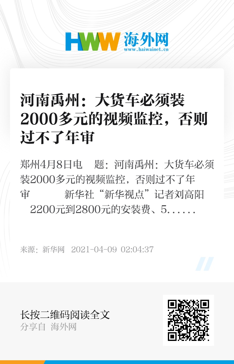 新华社郑州4月8日电 题:河南禹州:大货车必须装2000多元的视频监控,否则过不了年审