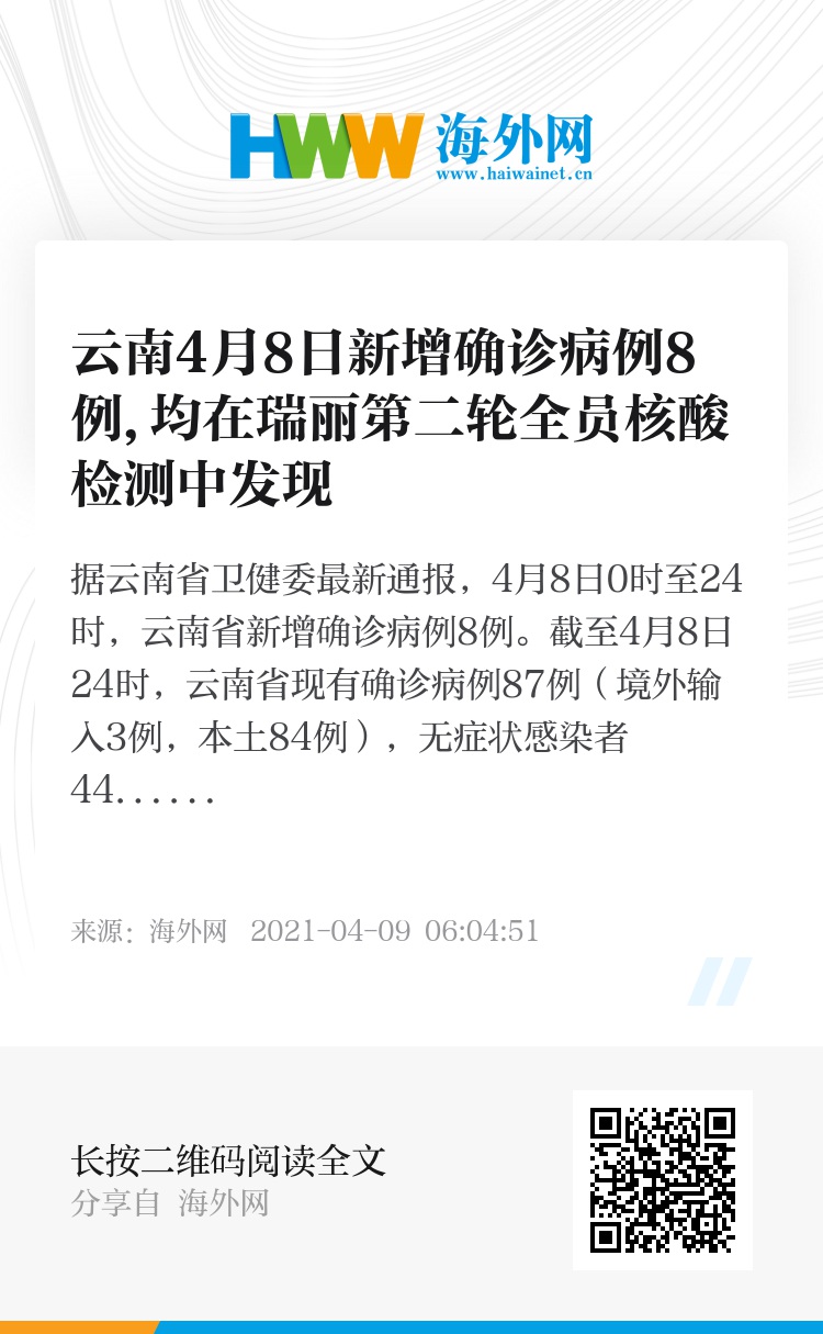 据云南省卫健委最新通报,4月8日0时至24时,云南省新增确诊病例8例。