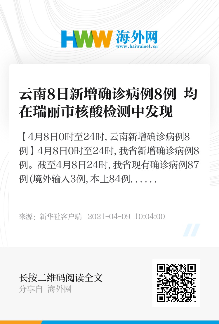 【4月8日0时至24时,云南新增确诊病例8例】4月8日0时至24时,我省新增确诊病例8例。截至4月8日24时,我省现有确诊病例87例(境外输入3例,本土84例),无症状感染者44例(境外输入19例,本土25例),均在定点医疗机构隔离治疗和医学观察。