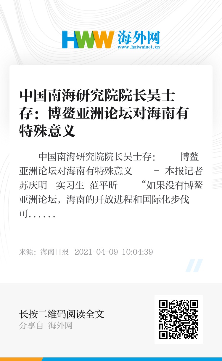 吴士存认为,历经20年成长,博鳌亚洲论坛已成为具有国际知名度的大型会议品牌,也是海南的一张名片。
